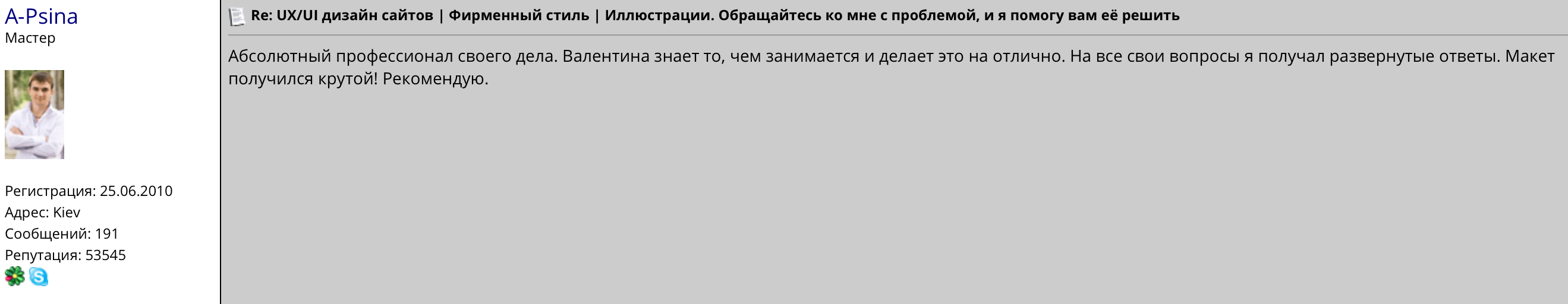 Абсолютный профессионал своего дела. Валентина знает то, чем занимается и делает это на отлично. На все свои вопросы я получал развернутые ответы. Макет получился крутой! Рекомендую.