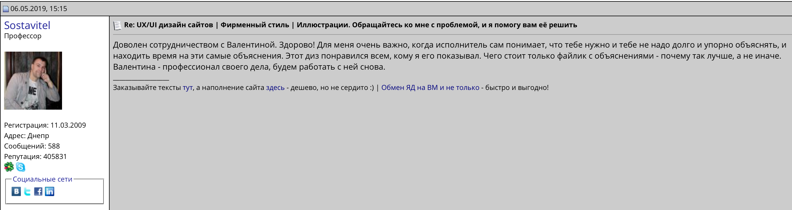 На этой странице вы найдете отзывы, которые оставили реальные заказчики после работы со мной. Многие отзывы размещены на профильных площадках и сайтах и их можно без труда найти.