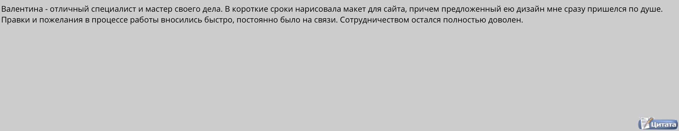 Валентина - отличный специалист и мастер своего дела. В короткие сроки нарисовала макет для сайта, причем предложенный ею дизайн мне сразу пришелся по душе. Правки и пожелания в процессе работы вносились быстро, постоянно было на связи. Сотрудничеством остался полностью доволен.